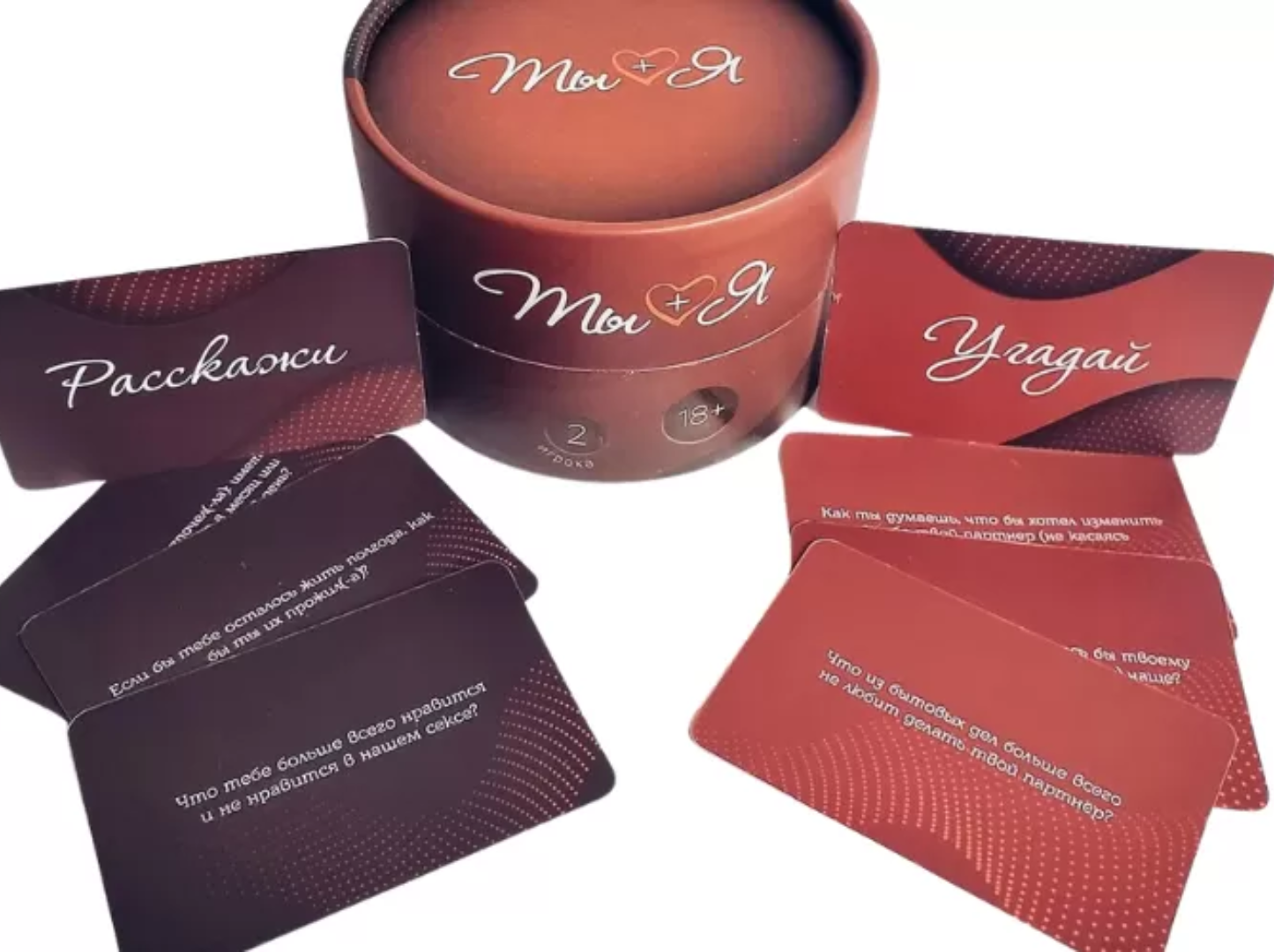 Карточки с заданиями предлагают партнерам найти новые точки взаимодействия, общие увлечения, взгляды, темы для бесед. Настольная игра Ты + Я отлично подойдет для улучшения отношений уже давно живущих вместе пар, так и для молодых партнеров. Игра позволит научиться понимать друг друга лучше и укрепить свои отношения. Ты + Я — это идеальный романтический подарок для твоей второй половинки.