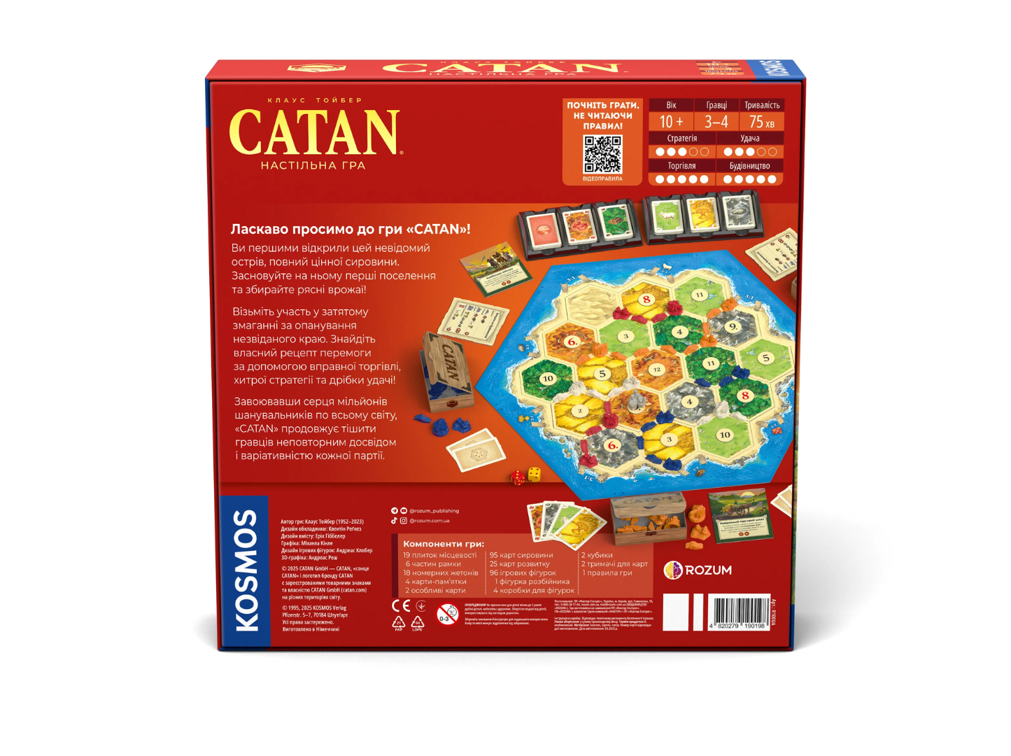 Катан (Catan) — одна из самых известных экономических настольных игр в мире. С момента выхода в 1995 году она стала настоящей классикой и положила начало эпохе современных евро-стратегий. В этой версии представлена украинская локализация игры от издательства Rozum. Все компоненты и правила — на украинском языке.