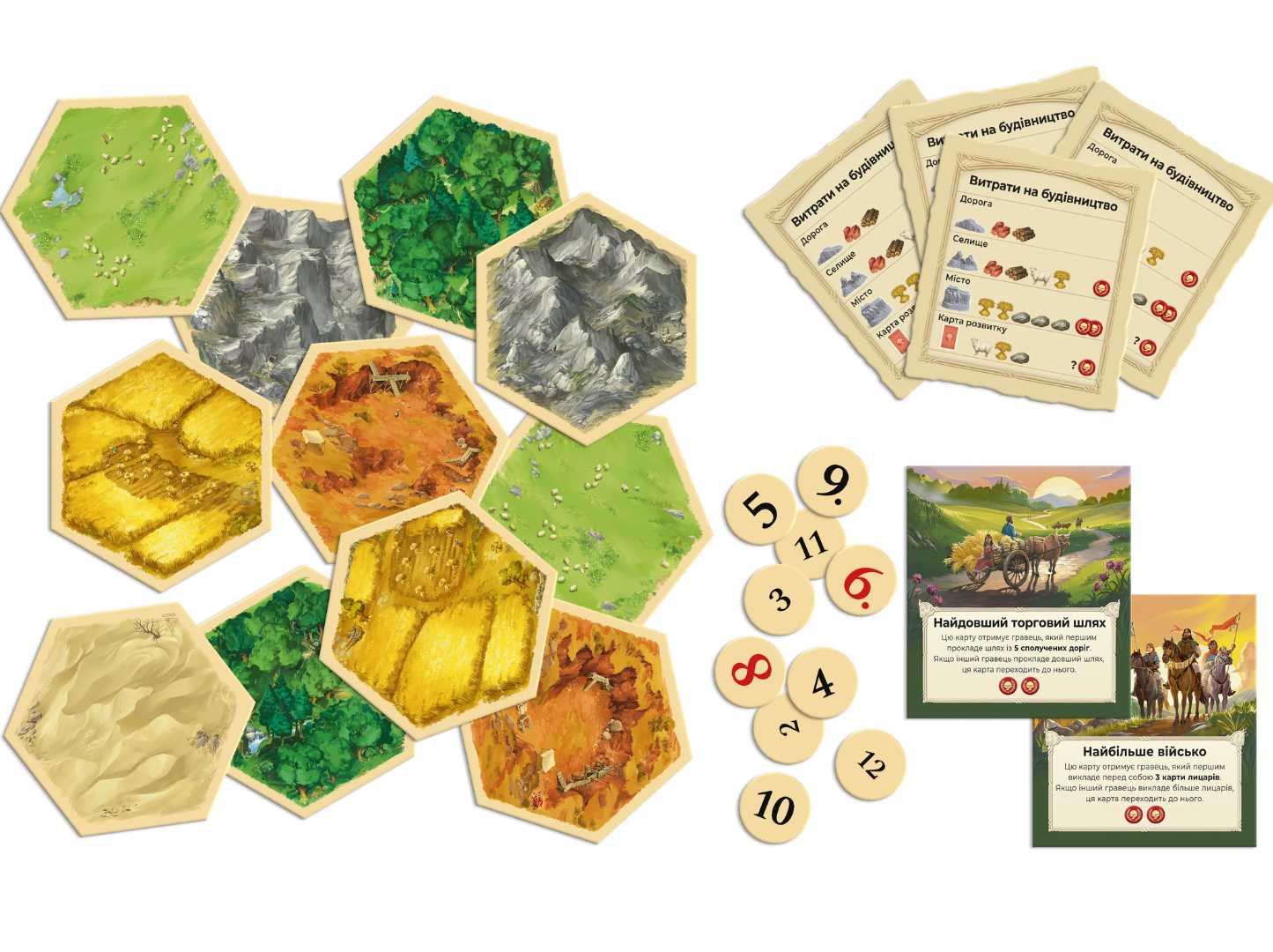 Поле состоит из гексов с разными типами местности: леса, поля, горы, пастбища и холмы. Каждый участок приносит ресурсы — дерево, кирпич, зерно, шерсть и руду.