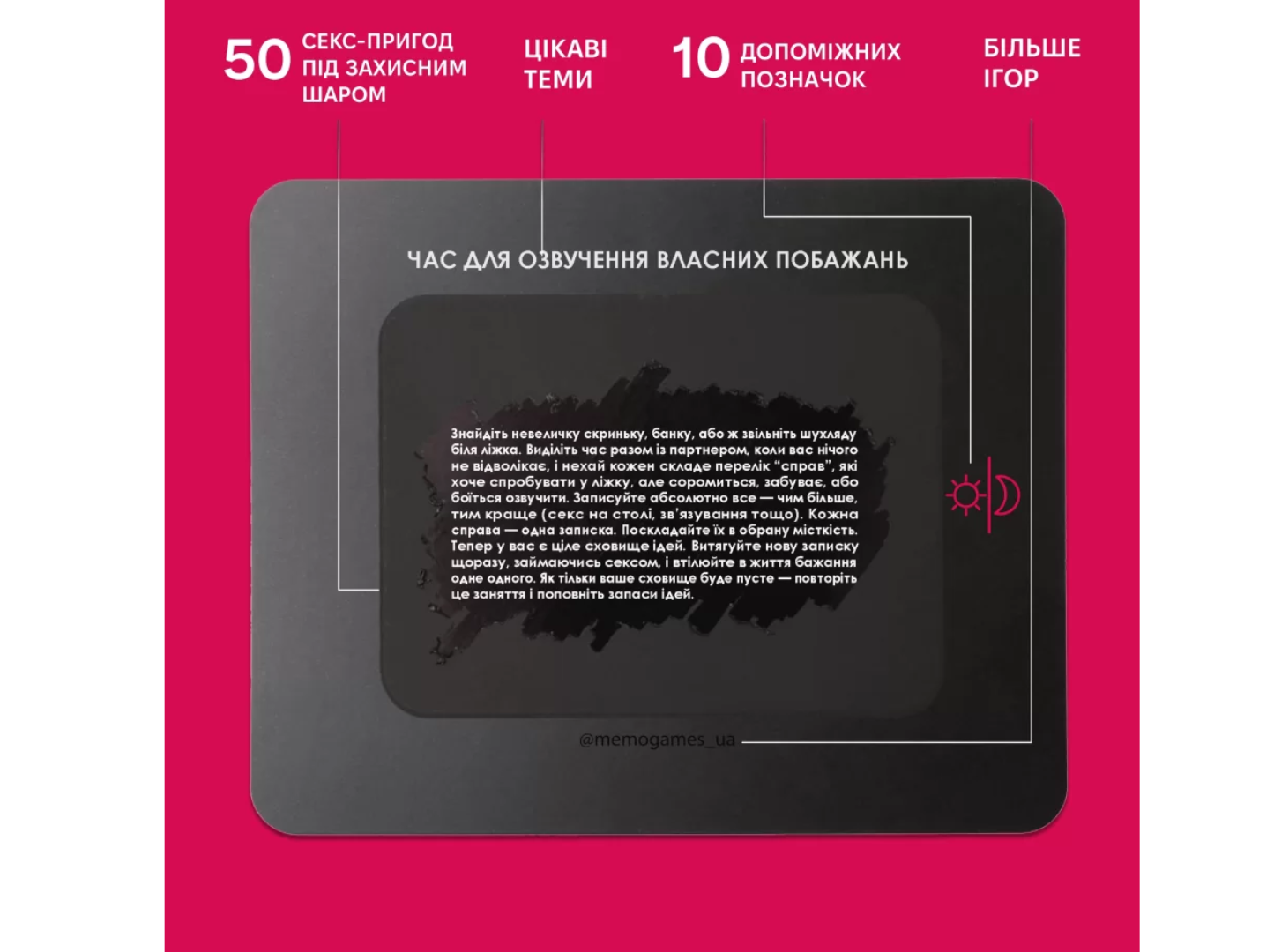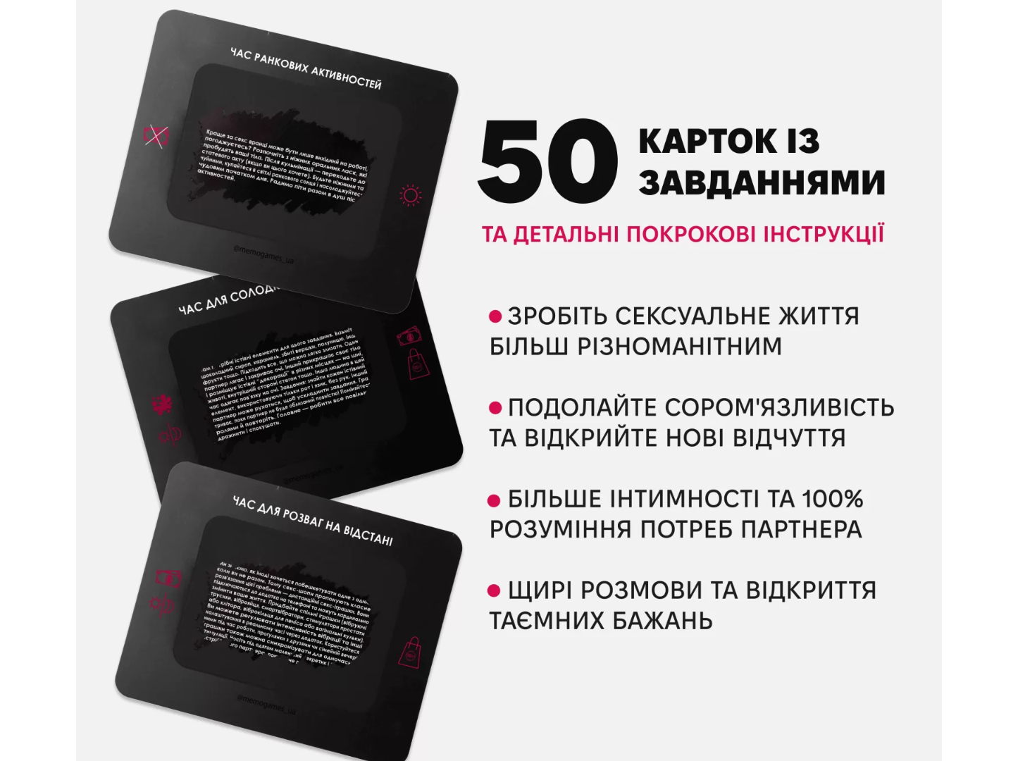 Современный ритм жизни часто мешает качественному общению и близости. Игра возвращает ценность совместного времени, помогает исследовать друг друга и вспомнить о скрытых желаниях. - Качественная близость