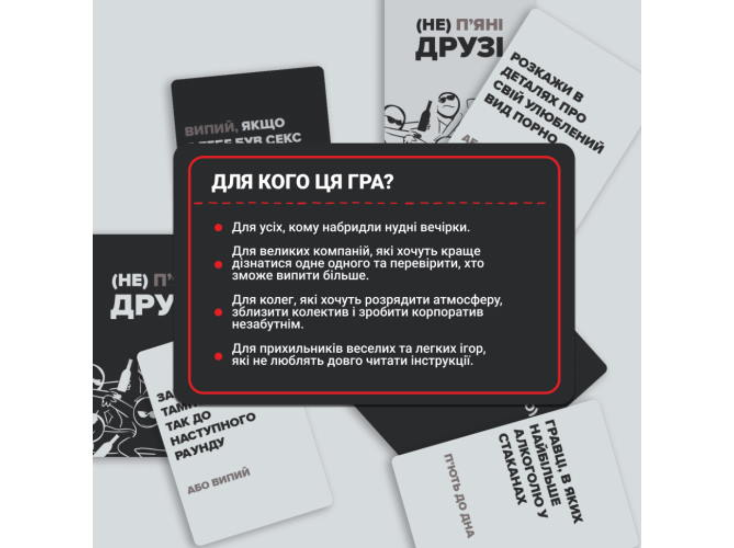 Соберите друзей, берите карты и готовьтесь к настоящему веселью! (Не) пьяные друзья (укр.) — это игра, которая превратит обычный вечер в феерическое событие. Готовы к веселью? Тогда начинайте — и пусть вечеринка станет легендарной!