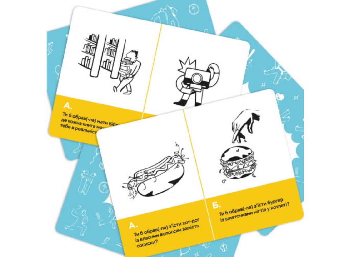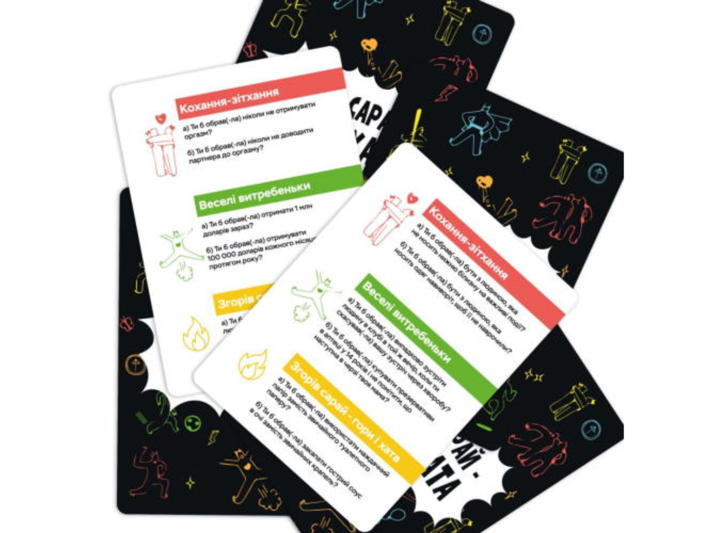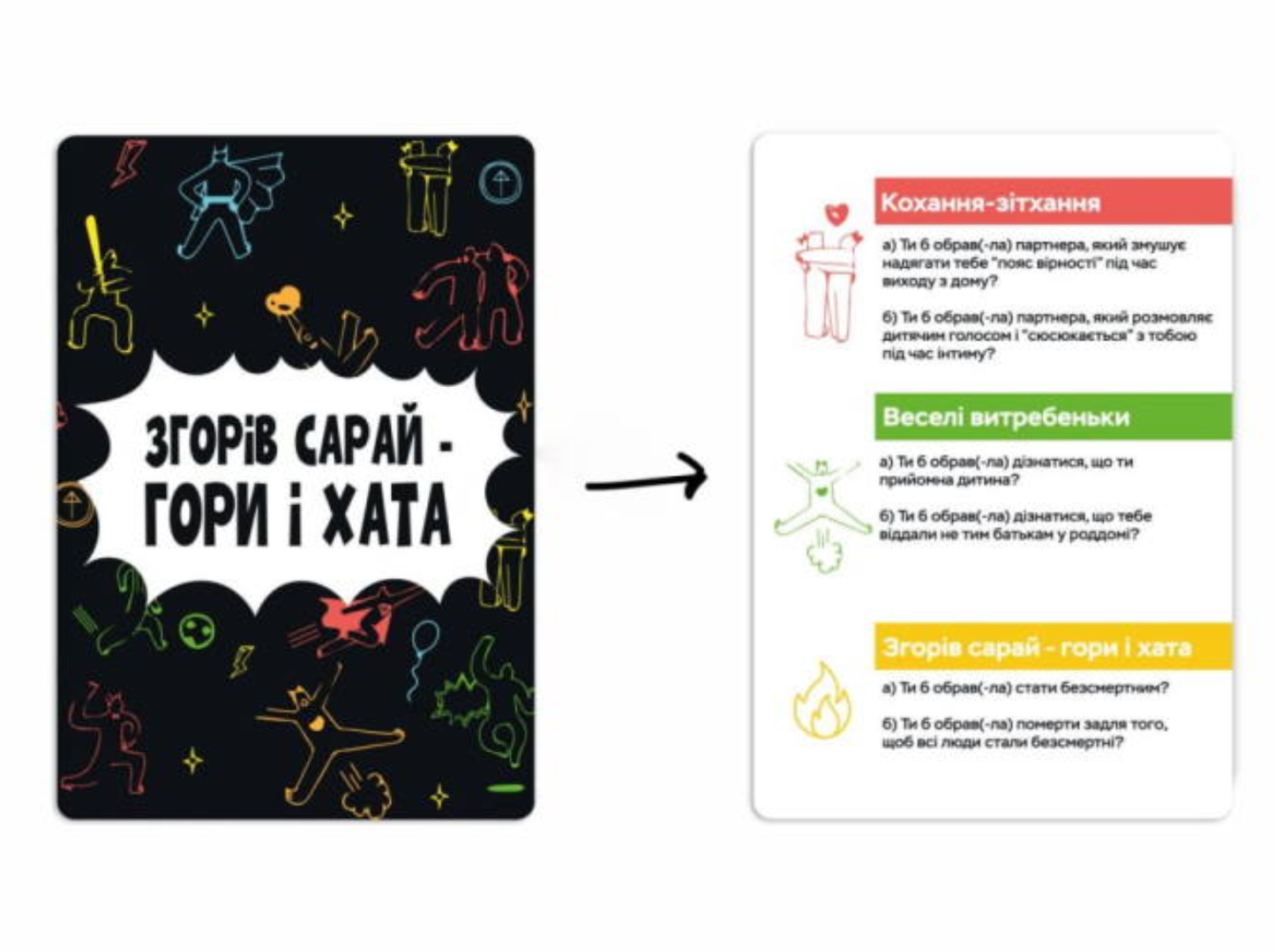 Готовы к неожиданным выборам и взрывному веселью? “Сгорел сарай – гори и дом (укр.)” — это игра, где каждый вопрос ставит вас перед непростым решением, а ответы приводят к смеху, удивлению и дружеским спорам. Это не просто развлечение, а способ узнать друг друга с новой стороны!