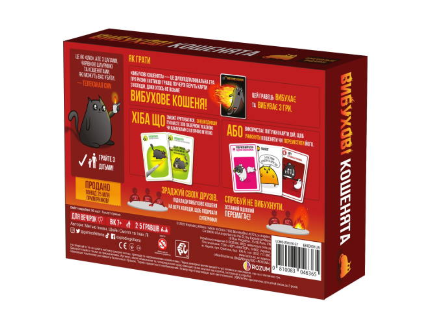 У колоді 56 унікальних карт із милими, кумедними та трохи шаленими котиками. Використовуйте карти «Підлестися», «Напади», «Втікай» та «Підглянь у майбутнє», щоб перехитрити суперників і залишитися в грі до перемоги.