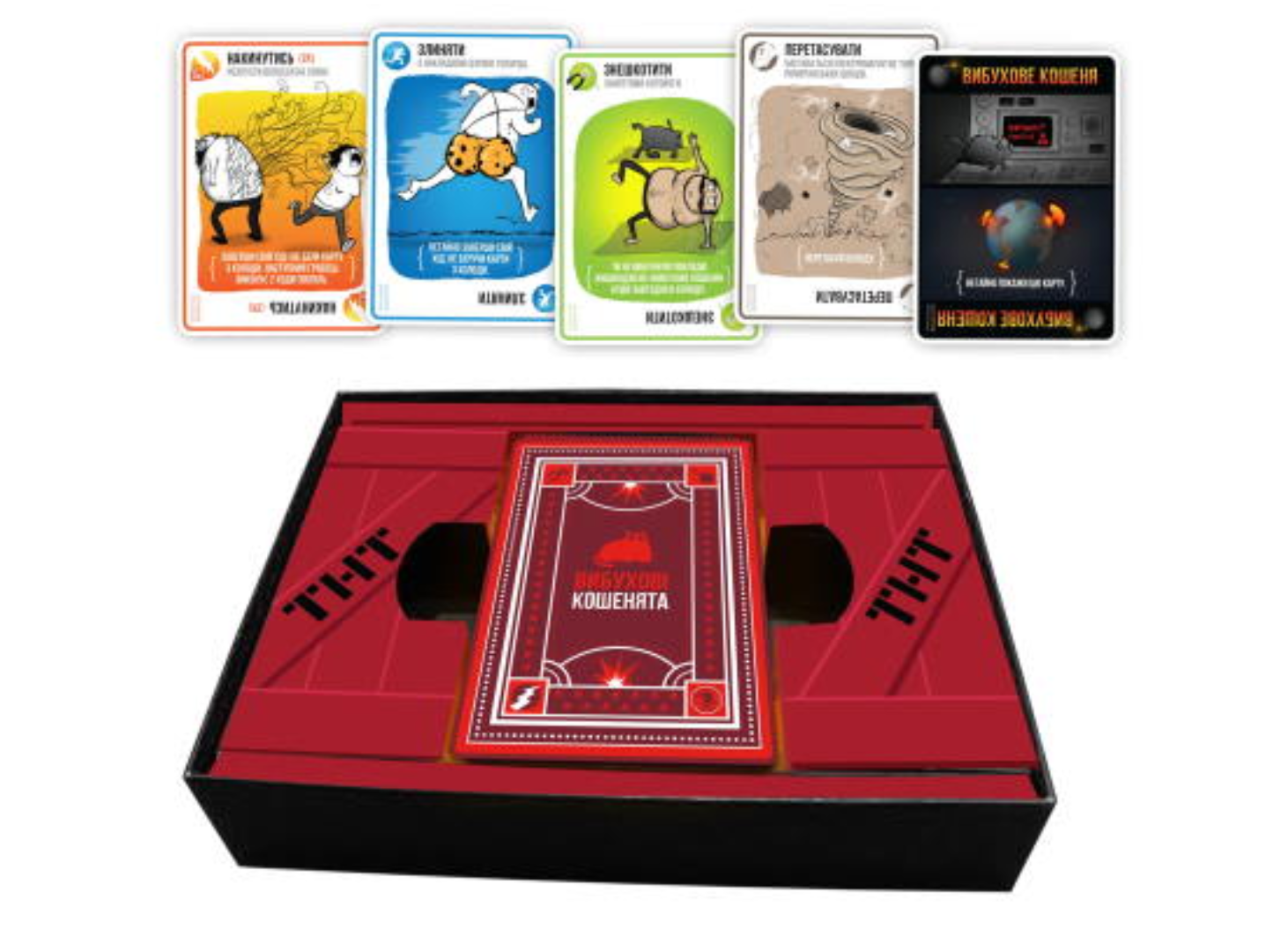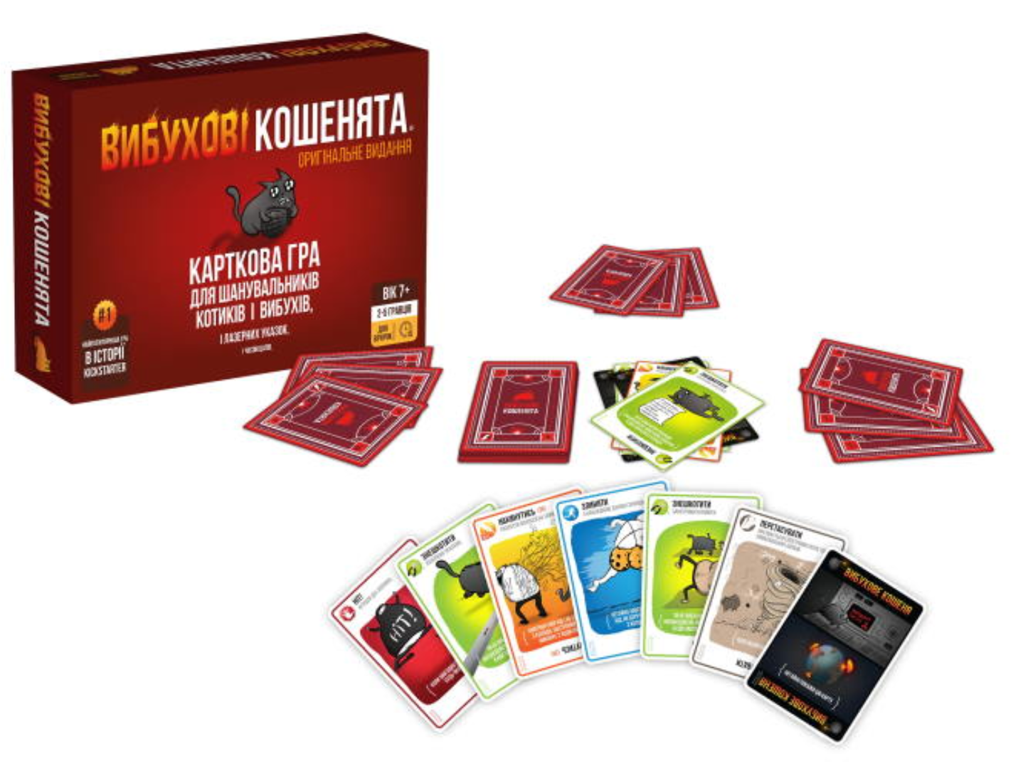 Це динамічна карткова гра, у якій вирішують удача, стратегія та холоднокровність. Гравці по черзі тягнуть карти з колоди, намагаючись уникнути вибухового кошеняти. Якщо карта з ним потрапила до вас — врятує лише карта знешкодження.